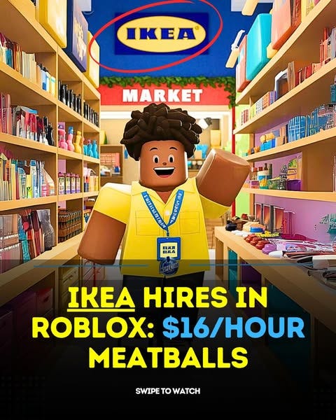 Then there’s IKEA, whose Roblox presence might be the most forward-thinking of them all. Last summer, the affordable furniture giant opened a virtual store inside Roblox — and with it, ten real paid jobs. Players who applied and were selected were paid £13.15 an hour to log into Roblox and, using their avatars, work virtual shifts inside IKEA’s digital store, helping other users shop for virtual furniture and (of course) serving up pixelated meatballs. In an online press release, IKEA described the experience as an example of how they do careers differently, saying, “Our co-workers are able to change roles, switch departments, and grow in any direction they choose, both in the game or in the real world.” That last line is key: these jobs were not only digital simulations of IKEA careers but also gamified auditions for careers in real life.